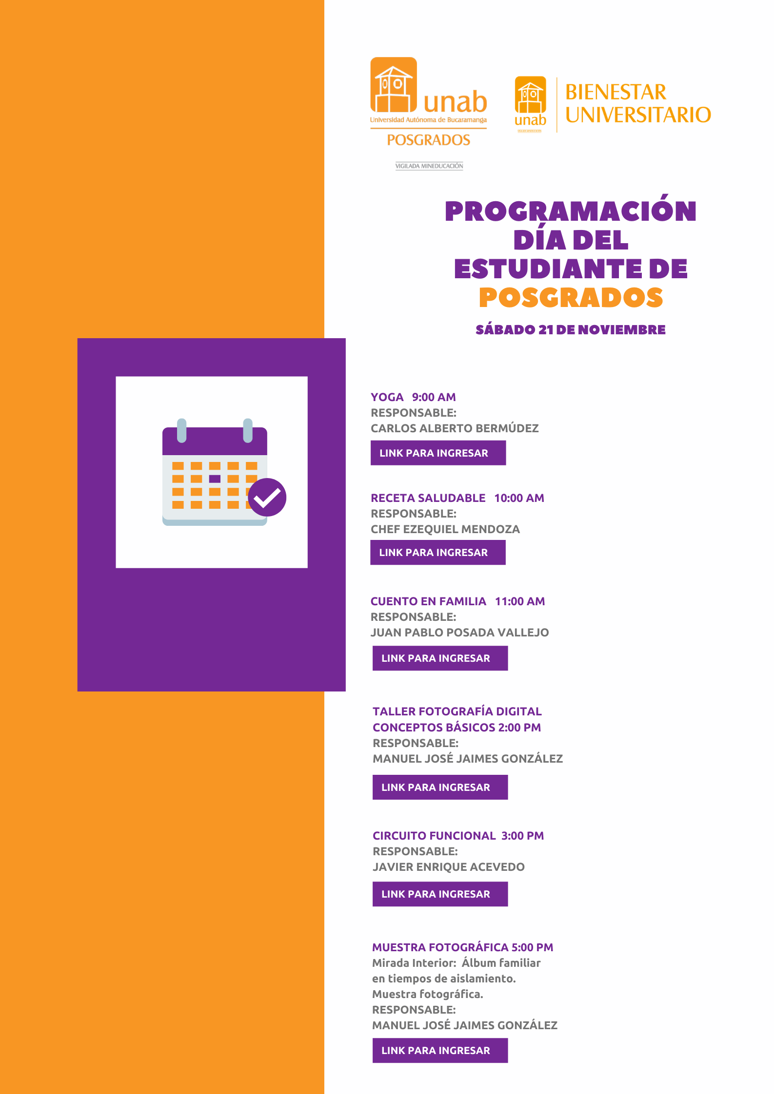 La Dirección General de Posgrados y Bienestar Universitario de la UNAB invita a los estudiantes de los Programas de Posgrados a participar el próximo 21 de noviembre desde las 9 a.m. en el Día del Estudiante de Posgrados.
