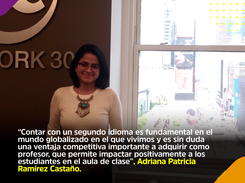 En esta oportunidad dos docentes tiempo completo, Adriana Patricia Ramírez Castaño de la Facultad de Estudios Técnicos y Tecnológicos y Lina María Osorio Valdés del programa de Licenciatura en Educación Infantil, junto a las docentes medio tiempo Nayda Ordoñez Torres del programa de Derecho y Andrea Carolina González Cárdenas, docente adjunta de Anestesiología, fueron las seleccionadas para viajar desde junio 24 y hasta julio 19 y participar en EC New York 30+, una escuela de Inglés para adultos mayores de 30 años.