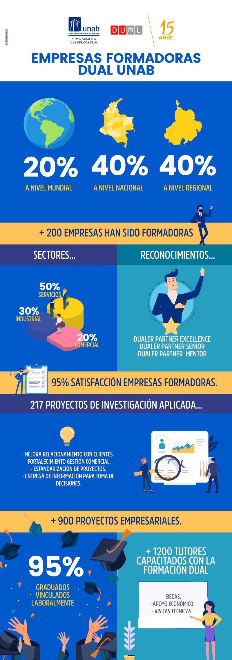 En los 15 años, que cumple en 2019 el programa de formación Dual en la UNAB, más de 250 empresas, con un campo de acción a nivel nacional e internacional, han vivido la experiencia de tener a un estudiante Dual con una experiencia exitosa de formación.