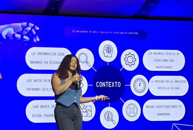 “La propuesta de nuestro equipo se llama WikiData y es una solución digital de una página web para solucionar el mayor problema del periodismo de datos, la falta de acceso a las bases de datos para periodistas. Creamos una página web de un mapamundi en donde los periodistas pueden subir sus investigaciones y así tener una página creada por y para periodistas”, contó la estudiante Nicole Marín.