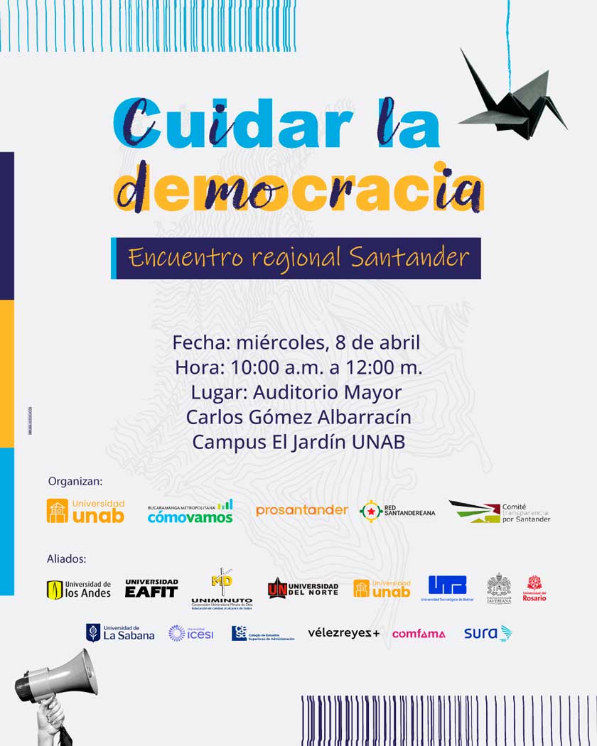 El próximo miércoles 8 de abril, la Universidad UNAB será sede del encuentro regional para el departamento de Santander de la campaña nacional «Cuidar la democracia», desarrollada por once universidades privadas del país, entre ellas la UNAB como única de la región, así como empresas y organizaciones sociales. En el encuentro se discutirán posibles estrategias para el cuidado y fortalecimiento de la democracia en la región.