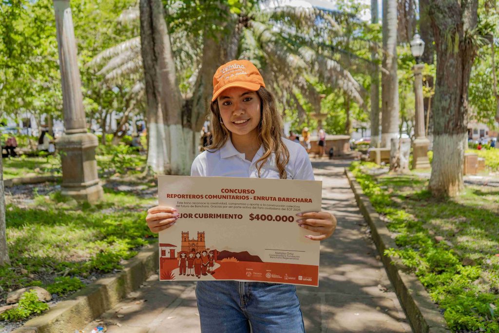 Durante el desarrollo del Foro Municipal de Esquema de Ordenamiento Territorial, realizado el 21 de septiembre, se premiaron los mejores trabajos comunitarios. “La UNAB fue clave en este proceso porque nos enseñaron cosas que no sabíamos y que nos ayudaron a hacer mejores reportajes. La formación de los docentes me ayudó mucho cómo expresarnos, cómo poner la cámara, los tipos de ubicaciones para el teléfono y también en el desarrollo de nuestro trabajo como reporteros conocimos personas y veredas que no habíamos visitado.”, relató Ainara Ramos Carreño, estudiante del Instituto Técnico Aquileo Parra de Barichara y miembro del grupo ganador a mejor reportaje comunitario.