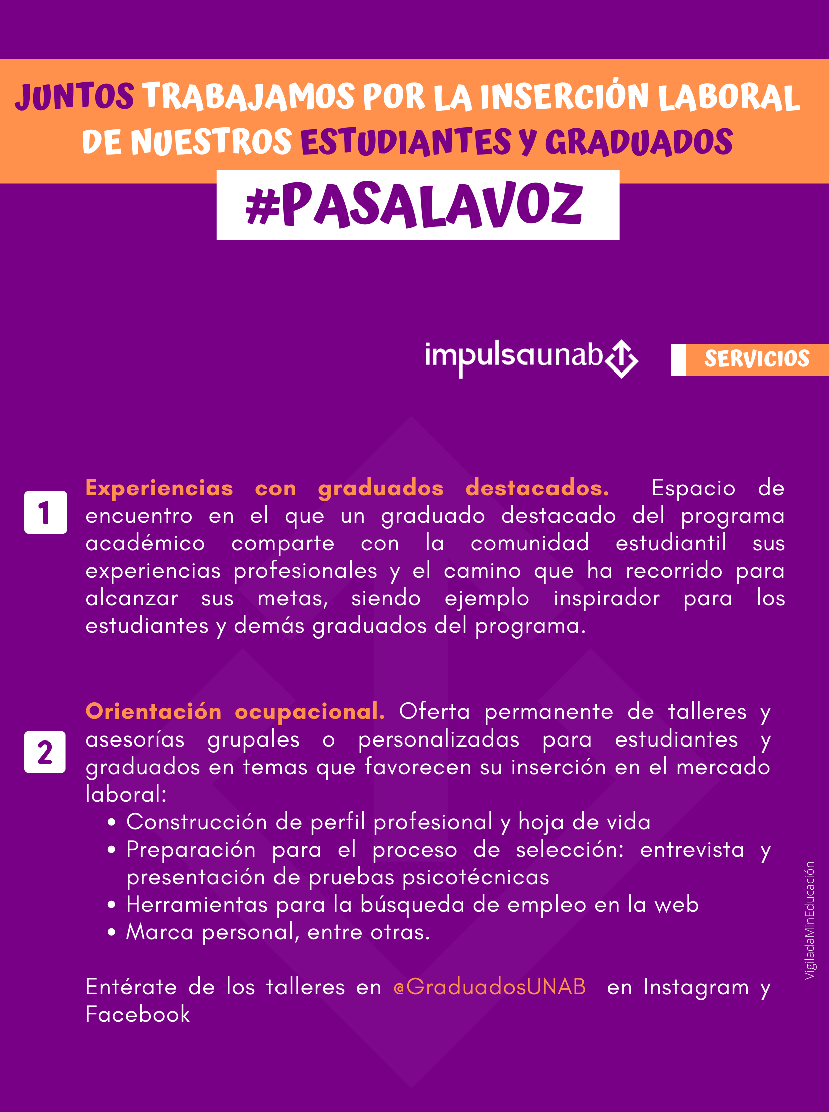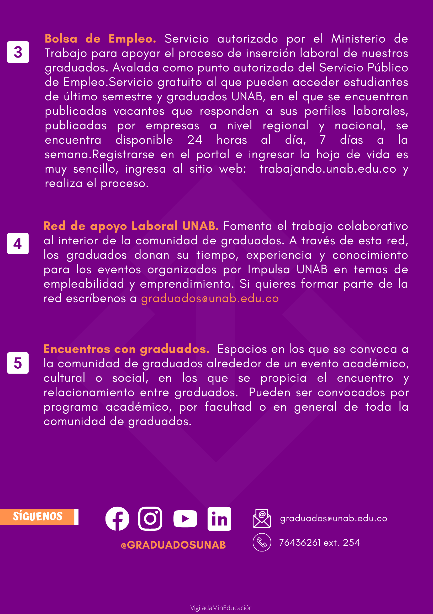 Impulsa UNAB: Centro de Desarrollo Profesional unidad encargada del relacionamiento con los graduados de la UNAB, tiene estructurados servicios para apoyar la gestión de los programas academicos con su comunidad de graduados.