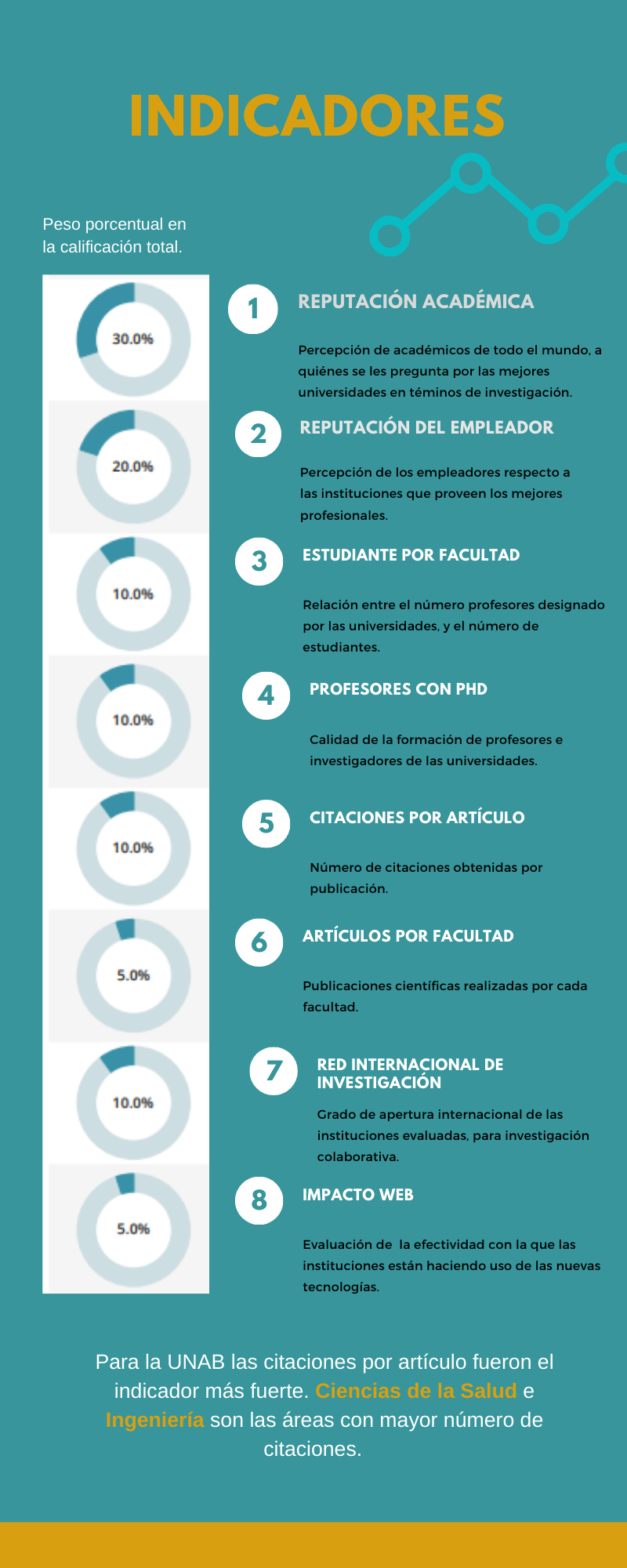 La UNAB, en su plan de desarrollo 2019 – 2024, definió como objetivo retador ser una comunidad educativa global y sostenible, reconocida entre las primeras 200 universidades en Latinoamérica. Por esta razón, desde este año, la Universidad adoptó este ranking como su fuente oficial de medición.