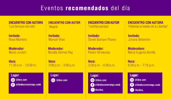 Ulibro 2020 completó la quinta jornada de actividades en una semana intensa en la que el público amante de la literatura, el arte y la cultura en general, ha seguido de cerca las charlas programadas con los escritores invitados a través de ulibro.com y las redes sociales de la feria del libro de Bucaramanga, en Facebook e Instagram.