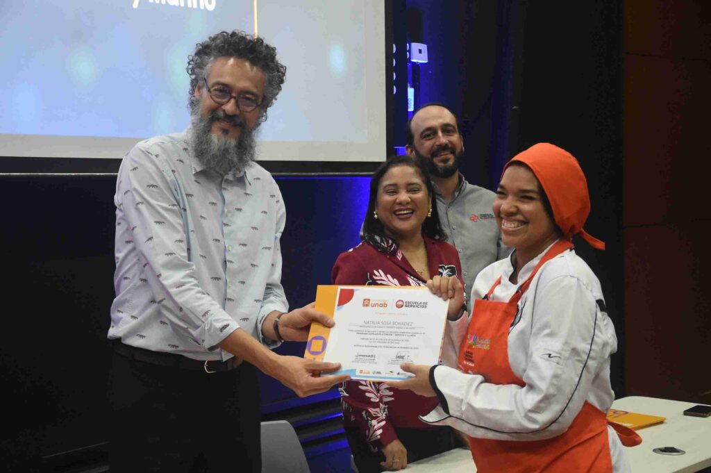 Agradeció a la Universidad UNAB ser la cuna de este proyecto, con el acompañamiento de la CCB. Resaltó que la propuesta de “Más empleo juvenil” les permite invertir recursos significativos en la Escuela de Servicios de Santander, ratificando su pertinencia y que se puede dar una mano a tantos jóvenes con potencial para que conecten con tantas oportunidades que hay en el entorno. “Las oportunidades en Santander, así como en otros lugares del mundo, están marcadas por la actitud, por cómo se dirigen al otro y cómo sirven. Así que no olviden que la decisión de volver o no a un lugar está mediada por el rol que ustedes empiezan a ejercer. Un trato agradable, amable, respetuoso y empático va a marcar toda la diferencia en la que ustedes son los protagonistas”, dijo Gómez Espinosa, quien añadió que la certificación que recibieron es un activo invaluable y está en ellos la decisión de entregar toda la energía y por ninguna razón ‘tirar la toalla’.