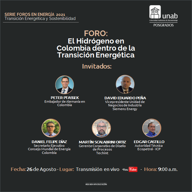 Este foro fue el primero de una serie de encuentros que se realizarán desde UNAB Campus Bogotá, como ejercicio académico de la Especialización en Recursos Energéticos. El segundo será este jueves 26 de agosto a las 9 a.m. y tendrá como temática “El hidrógeno en Colombia dentro de la transición energética”. Los interesados en participar pueden registrarse en el siguiente enlace