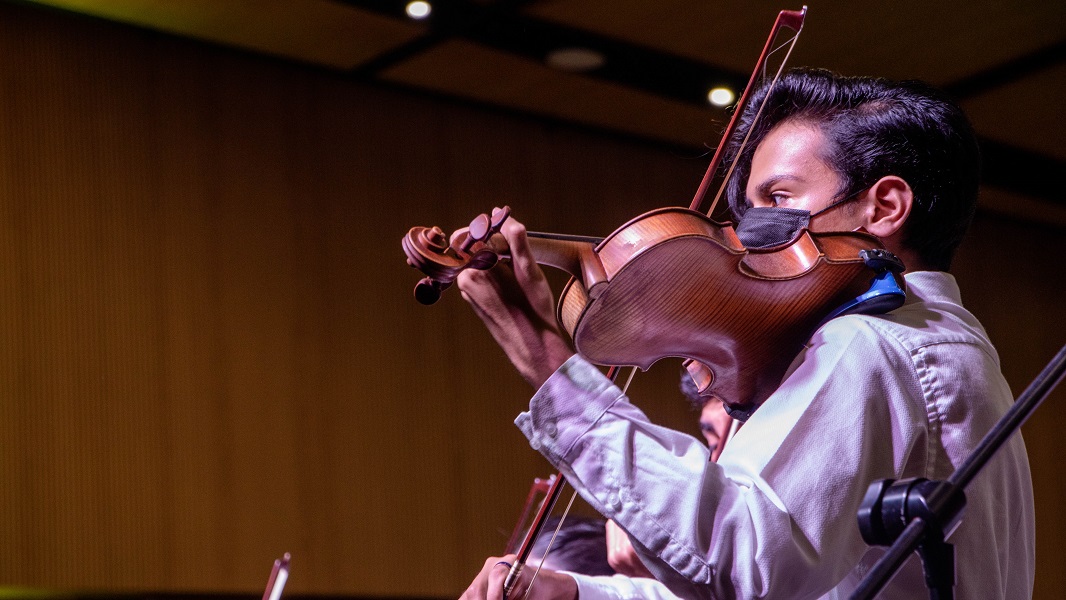 El concierto inició con el ensamble de violines y violas bajo la dirección de la maestra Irina Litvin. Posteriormente, las maestras del programa de Música, Luz Helena Peñaranda y Maryna Shevtsova, interpretaron en voz y piano, respectivamente, obras de José Rozo Mosquera y Adolfo Mejía.