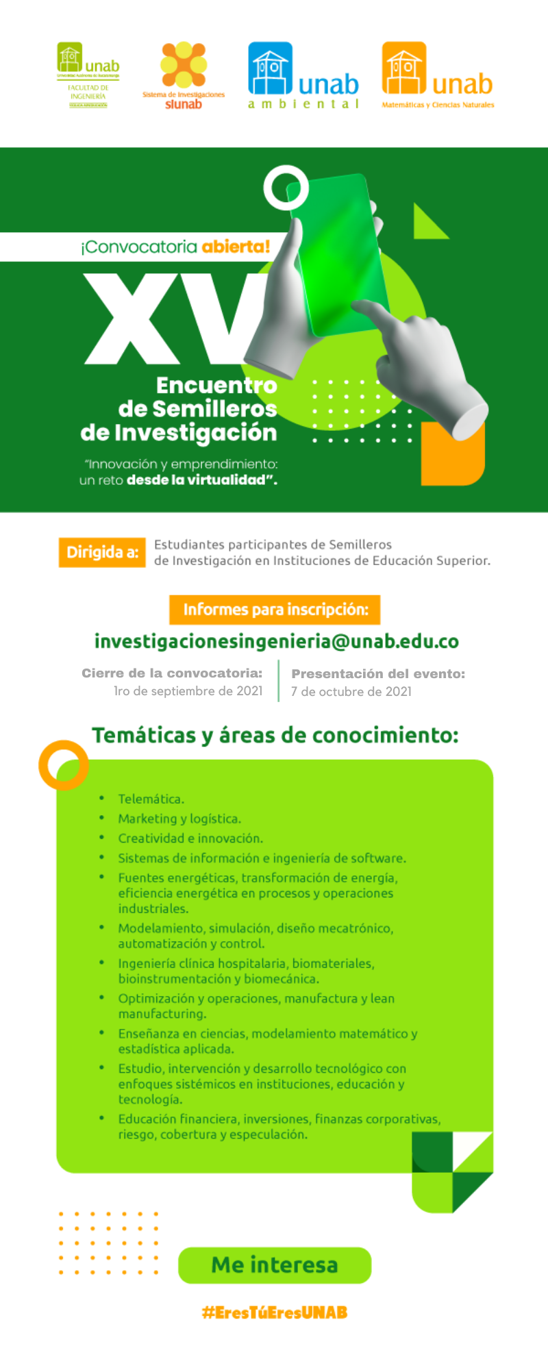 La Dirección de Investigaciones en coordinación con la Facultad de Ingeniería, UNAB Ambiental y el Departamento de Matemáticas y Ciencias Naturales los invita a participar del «XV Encuentro de Semilleros de Investigación UNAB 2021 «Innovación y emprendimiento: un reto desde la virtualidad».