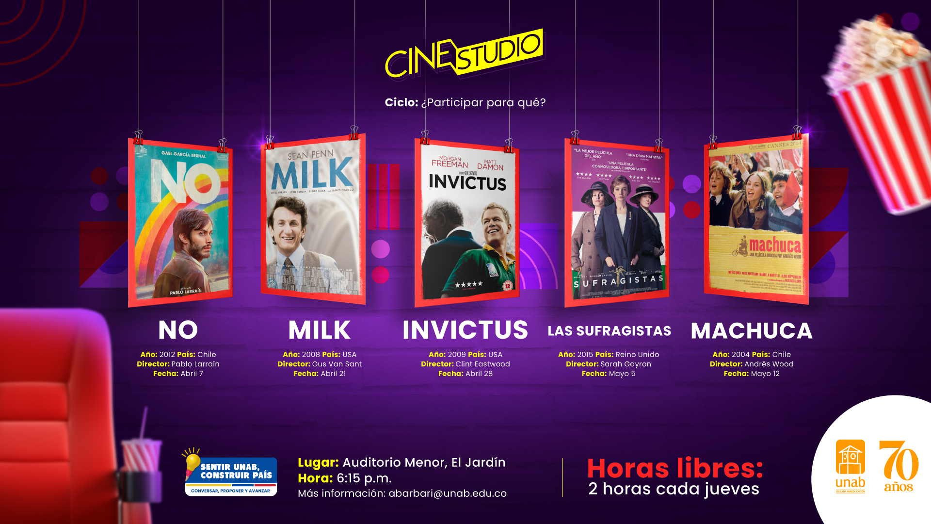 Dese al año 2015 el CinEstudio Unab se ha consolidado como un espacio creado para la formación social y humana entonces, gracias al trabajo de estudiantes de Artes Audiovisuales y profesores del Departamento de Estudios Sociohumanísticos. Han sido siete años proyectando películas sobre Diversidad sexual, Género, Migraciones, Diversidad Étnica, Derechos Humanos, Discapacidad, entre otros abordajes sociales.