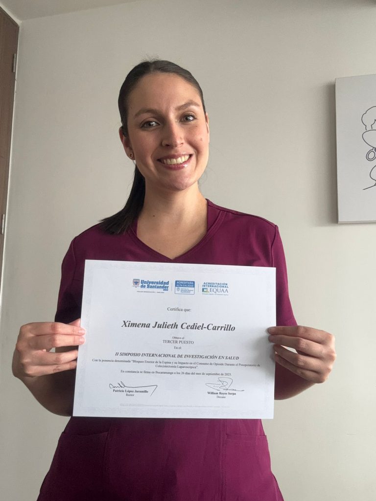Igualmente, destacó que este reconocimiento refleja la constancia y el propósito que la motivaron a investigar durante su residencia. “En lo personal, aprendí que investigar exige constancia, paciencia y pasión, y que resulta profundamente satisfactorio ver cómo un proyecto académico puede convertirse en un aporte para la toma de decisiones que beneficien a muchos pacientes”.
