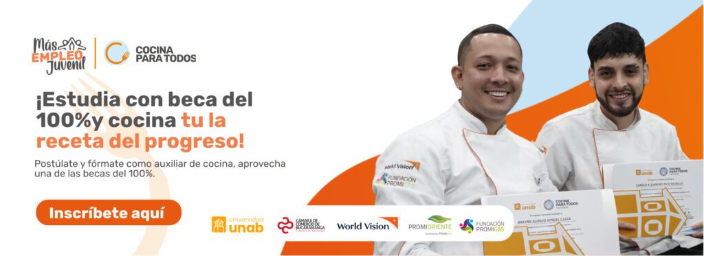 Gracias a la alianza entre Promioriente y su Fundación Promigas, la UNAB, la Cámara de Comercio de Bucaramanga y World Vision, 75 jóvenes entre los 18 y 30 años podrán acceder a becas completas para formarse como Auxiliares de Cocina, con prácticas empresariales reales y acompañamiento para su vinculación laboral formal.